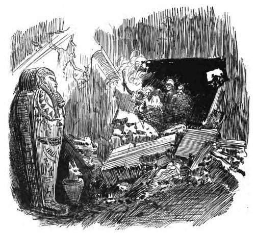 Robert Magrin, presque grisé par l'odeur âcre et pénétrante qui se dégageait des bitumes et des aromates depuis si longtemps concentrés sur ce corps et que l'air vivifiait avec une trop soudaine intensité, se sentait mal à l'aise et inquiet. Ce sportsman n'était décidément pas fait pour ces missions scientifiques; sa gorge était serrée par ces émanations d'outre-tombe, et toutes ces poussières impalpables, qui prenaient leur essor dans l'atmosphère, pénétraient en lui, l'indisposaient plus qu'il n'aurait su le dire, et, pour la première fois peut-être, pensait-il sérieusement au néant des êtres, à la vanité de toutes choses devant ces résidus fanés qui se brisaient au moindre toucher.