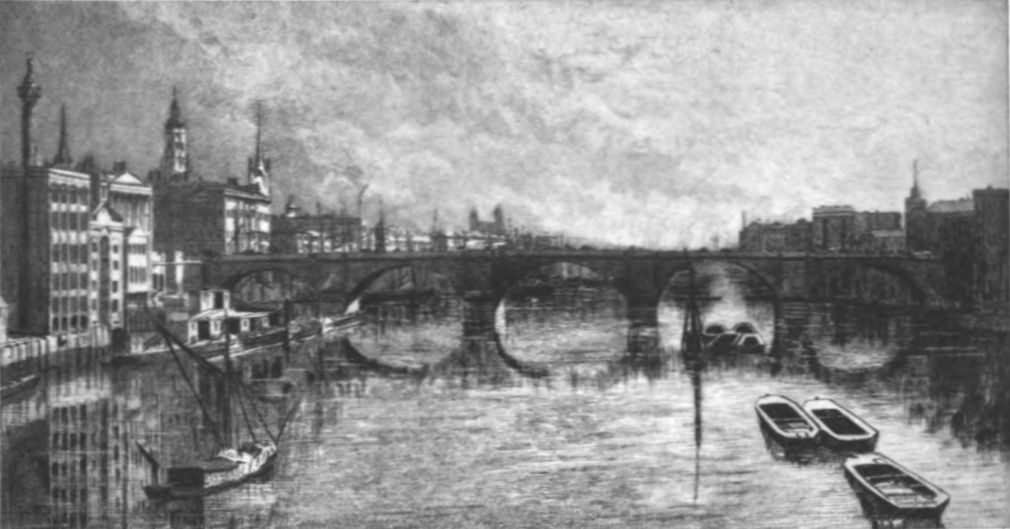 In the placid stream are mirrored the shadows of the bridge; to the west of which appear the façades of Fishmonger's Hall, and Billingsgate market, radiant with morning. To appreciate the full charm and fidelity to nature of this etching one should read Wordsworth's sonnet written on Westminster bridge, beginning "Earth has not anything to show more fair," and ending with the words