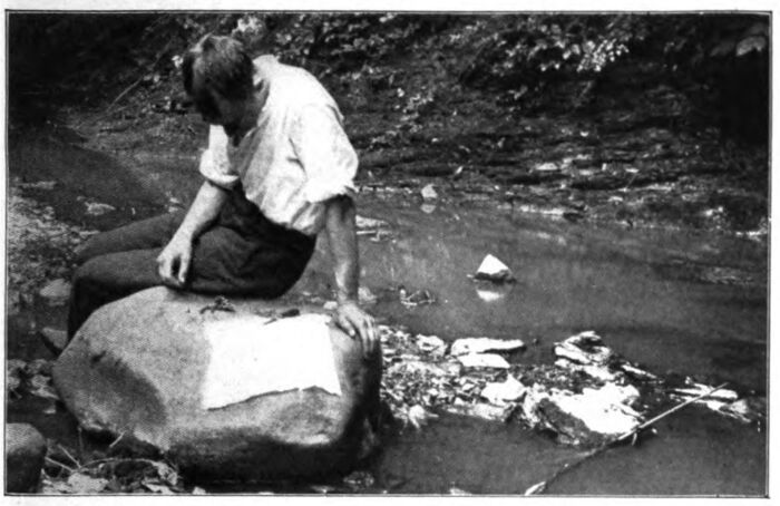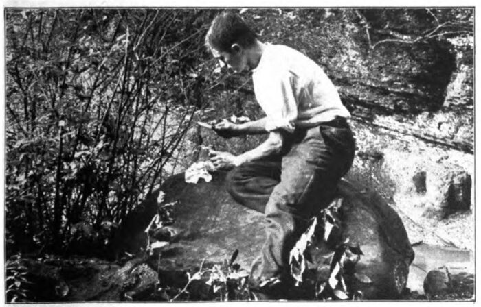 Sparks gleamed against the handkerchief, but no sign of charring cloth or wisp of smoke rewarded me. Surely, I thought, these sparks must be as hot as the tiny, glowing ember from Joe’s pipe, and I unfolded and examined the handkerchief about the burned spot. Perhaps, I thought, this particular part of the cloth was more inflammable than the rest, and again gathering up the handkerchief, with the old burn close to the pebble, I again struck it with my knife.