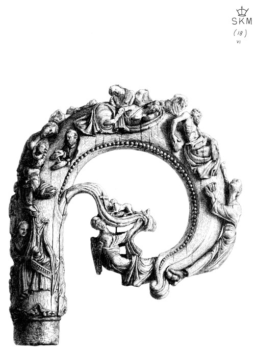It is perhaps not to be wondered at that a Tau should be, as we know it is, amongst the most rare of ornaments or utensils in ivory which have been preserved. The early and total disuse of them would have naturally led to their destruction and loss, sometimes wilful, sometimes accidental. But that the pastoral staff (that is, the head of it) should be of almost equal rarity is less easily to be explained. Few collections possess a good example; still fewer more than one. Nevertheless, in England alone pastoral staffs must have been almost [Pg 91] without number at the beginning of the sixteenth century; and although many were probably of metal, silver or copper enamelled and having some intrinsic value, yet an equal or perhaps greater number were of ivory. Not merely bishops but the heads of religious houses, abbots and abbesses, carried them as official tokens of their rank and dignity. We find frequent mention of them in the old inventories. For example, at St. Paul’s, in 1295; “Item, baculus cum cambuca eburnea, continente agnum.” “Item, baculus de peciis eburneis, et summitate crystallina,” etc. “Cambuca” is a word often used in the middle ages for the staff itself; derived, perhaps, from κάμπτω, I bend.