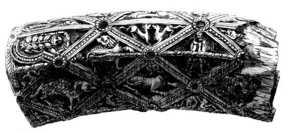 There are several very fine horns in the South Kensington collection, more especially no. 7954, engraved in the accompanying woodcut, and which is unequalled by any other of its kind known. The style and workmanship are rare; one, probably by the same hand, was lately in the possession of a noble English family. The horns which we find frequently mentioned in mediæval wills and inventories are hunting horns. For example, Sir John de Foxle in 1378 leaves to the king his great bugle horn, ornamented with gold. “The ivory horn of St. Oswald the king” was preserved at Durham in the year 1383. Near the end of the thirteenth century there were two ivory horns kept in the treasury of St. Paul’s: “Item, cornu eburneum gravatum bestiis et avibus, magnum. Item, aliud cornu eburneum planum et parvum.”