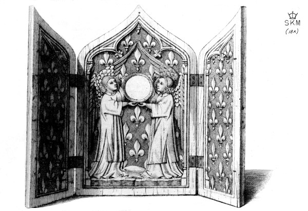 There are two remarkable and important illuminations in the manuscript psalter of queen Mary, which has been more than once referred to (p. 74). In one is a shrine, open, with the decorations usual early in the fourteenth century. The centre is divided into two compartments. Above is the Annunciation; the Blessed Virgin and an angel; each under a pointed arch, cusped and crocketed. Below, is the Visitation; Elizabeth and the Virgin meet under a gateway and embrace. The wings are filled with saints, each standing under a pointed arch. This illumination precedes the psalter, following the calendar, after the Old Testament history. The other represents a triptych: in the middle is the Virgin and Child; she is sitting and giving Him the breast; two angels stand by, swinging censers; in each wing is an angel with a candlestick.