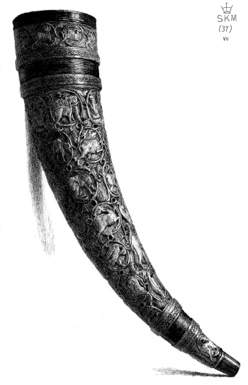 There is only one horn at South Kensington which can be regarded as having been a tenure horn. It is possible that no. 7953 (see the etching) may have been a horn of that kind. Several of these tenure horns are still preserved in England and were shown in the loan exhibition of 1862. Among them the most famous are the horn of Ulphus, in the treasury at York; the horns given by Henry the first to the cathedral at Carlisle; and the Pusey horn. The ivory hunting horn (so-called) of Charlemagne is kept at Aix la Chapelle; and another said to have been Roland’s in the cathedral at Toulouse.