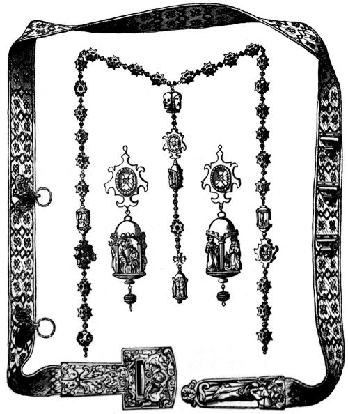 Chaplets of ivory beads for private devotion were very common in the middle ages, and are often mentioned in letters and other documents. Some good examples still exist in various collections. The woodcut on the next page represents a set, and a girdle with ivory clasps, in the collection of M. Achille Jubinal. [Pg 112]