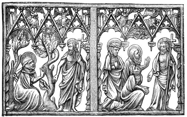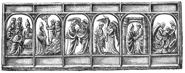 The other is a complete row from a book cover in the British museum: divided into thirty compartments, each an inch by three quarters of an inch. It is impossible in a woodcut to do more than attempt to give some idea of the marvellous delicacy and excellence of the panel itself, which is beyond all comparison the very finest ivory existing of its peculiar school. Small, even minute, as the divisions are, they [Pg 116] plainly tell the story which each is intended to convey; although in some of them there are as many as seven or eight figures, finished with admirable distinctness and perfection. The subjects in this row are the offering of St. Joachim; his departure into the desert; the message of the angel to St. Joachim; the message to St. Anne; the meeting of St. Joachim and St. Anne at the gate; and the birth of the Blessed Virgin. The etching represents some beautiful panels in open work, at South Kensington.