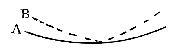 Length of Pendulum.—A pendulum is a falling body and as such is subject to the laws which govern falling bodies. This statement may not be clear at first, as the pendulum generally moves through such a small arc that it does not appear to be falling. Yet if we take a pendulum and raise the ball by swinging it up until the ball is level with the point of suspension, as in Fig. 1, and then let it go, we shall see it fall rapidly until it reaches its lowest point, and then rise until it exhausts the momentum it acquired in falling, when it will again fall and rise again on the other side; this process will be repeated through constantly smaller arcs until the resistance of the air and that of the pendulum spring shall overcome the other forces which operate to keep it in motion and it finally assumes a position of rest at the lowest point (nearest the earth) which the pendulum rod will [Pg 11] allow it to assume. When it stops, it will be in line between the center of the earth (center of gravity) and the fixed point from which it is suspended. True, the pendulum bob, when it falls, falls under control of the pendulum rod and has its actions modified by the rod; but it falls just the same, no matter how small its arc of motion may be, and it is this influence of gravity—that force which makes any free body move toward the earth’s center—which keeps the pendulum constantly returning to its lowest point and which governs very largely the time taken in moving. Hence, in estimating the length of a pendulum, we must consider gravity as being the prime mover of our pendulum.