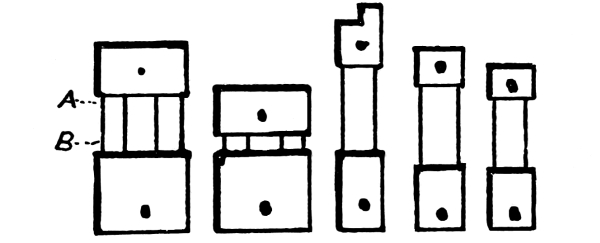 The German clocks are generally those of the Schwartzwald (or Black Forest) district, and differ from others in their structure, chiefly in the following particulars: The movement is supported by a horizontal seatboard in the upper portion of the case. The wooden trains of many of the older type instead of being supported by plates are held in position by pillars, and these pillars are held in position by top and bottom boards. In the better class of wooden clocks the pivot holes in the pillars are bushed with brass tubing, while the movement has a brass ’scape wheel, steel wire pivots and lantern pinions of wood, with steel trundles. In all these clocks the front pillars are [Pg 7] friction-tight, and are the ones to be removed when taking down the trains. Both these and the modern Swartzwald brass movements use a sprocket wheel and chain for the weights and have exposed pendulums and weights.