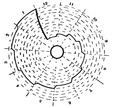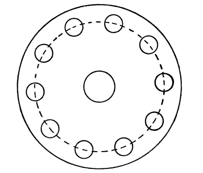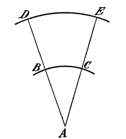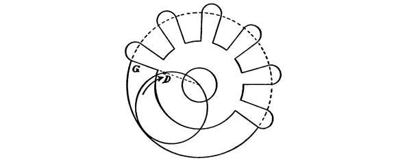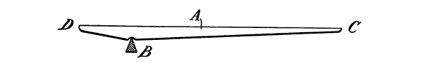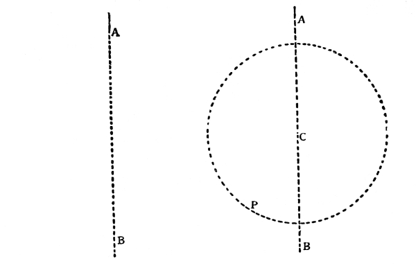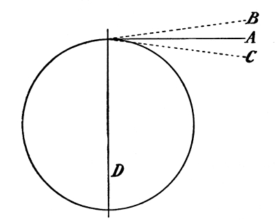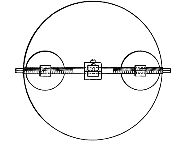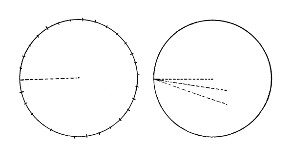 As the length of the rod governs the distance through which our bob is allowed to fall, and also controls the direction of its motion, we must consider this motion. Referring again to Fig. 1, we see that the bob moves along the circumference of a circle, with the rod acting as the radius of that circle; this opens up another series of facts. The circumference of a circle equals 3.1416 times its diameter, and the radius is half the diameter (the radius in this case being the pendulum rod). The areas of circles are proportional to the squares of their diameters and the circumferences are also proportional to their areas. Hence, the lengths of the paths of bobs moving along these circumferences are in proportion to the squares of the lengths of the pendulum rods. This is why a pendulum of half the length will oscillate four times as fast. [Pg 12]