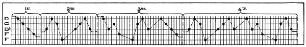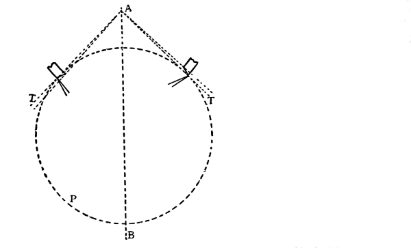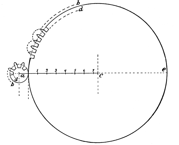 Now we will apply these figures to our pendulum. A body falling in vacuo, in London, moves 32.2 feet in one second. This distance has by common consent among mathematicians been designated as g. The circumference of a circle equals 3.1416 times its diameter. This is represented as π. Now, if we call the time t, we shall have the formula: