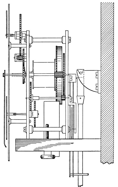 The man who starts out to design and build a clock will find himself limited in three particulars: It must run a specified time; the arbor carrying the minute hand must turn once in each hour; the pendulum must be short enough to go in the case. Two of these particulars are changeable according to circumstances; the length of time run may be thirty hours, eight, thirty, sixty or ninety days. The pendulum may be anywhere from four inches to fourteen feet, and the shorter it is the faster it will go. The one definite point in the time train is that the minute hand must turn once in each hour. We build or alter our train from this point both ways, back through changeable intermediate wheels [Pg 9] and pinions to the spring or weight forming the source of power, and forward from it through another changeable series of wheels and pinions to the pendulum. Now as the pendulum governs the rate of the clock we will commence with that and consider it independently.