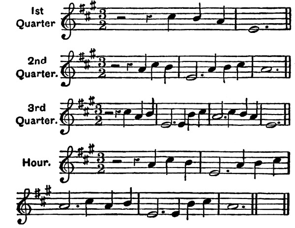 Midi music recordings have been provided containing the Westminster chimes shown in Fig. 122. Click on the links below the figure to listen to the chimes if this is supported by your browser or device.