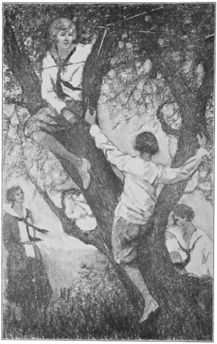 Several of them, dropping the sheets that swathed them, ran for cover, away from the police. But the boys were too quick for them. Darting from their hidden vantage point among the trees, they waylaid the rascals and engaged them in lusty warfare. Back and forth they lunged, fighting desperately, while the girls watched with fascinated interest.