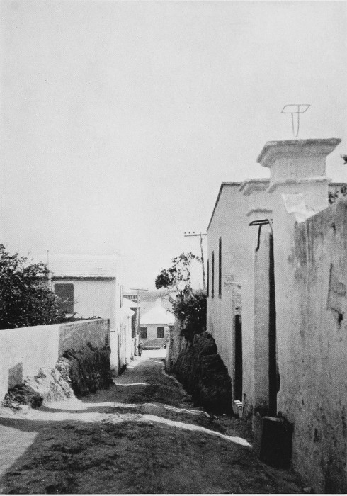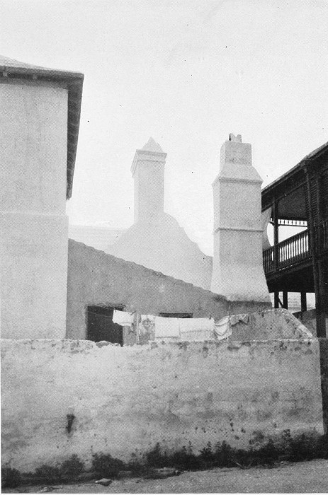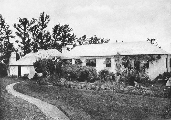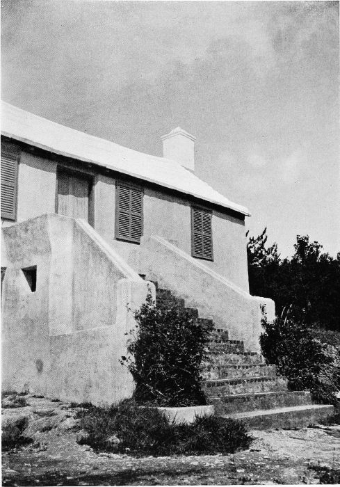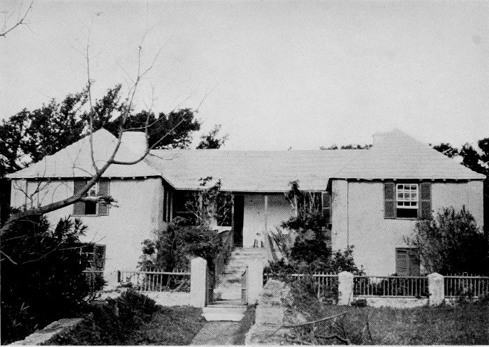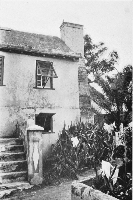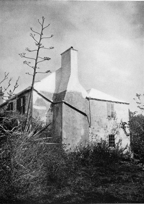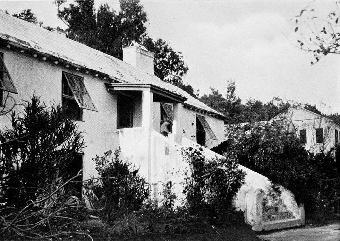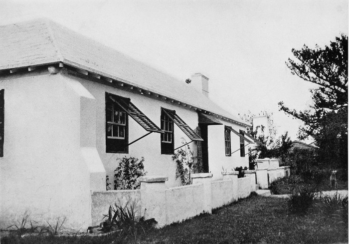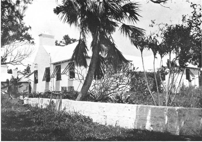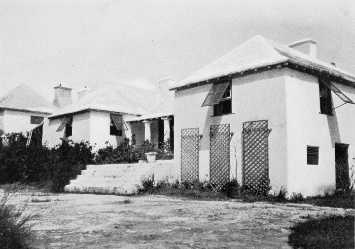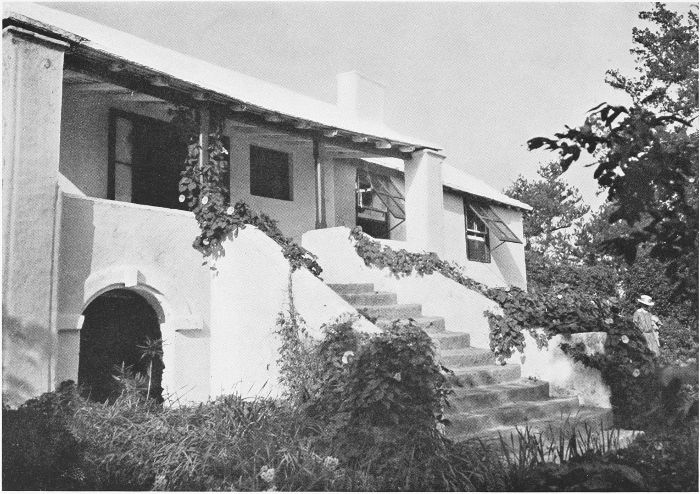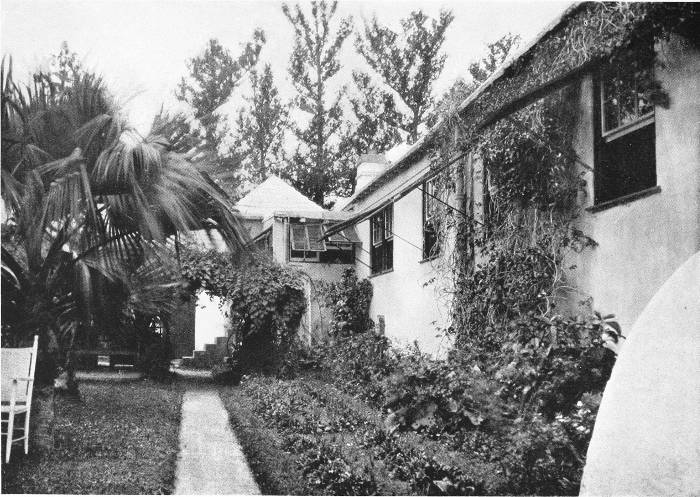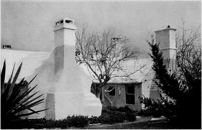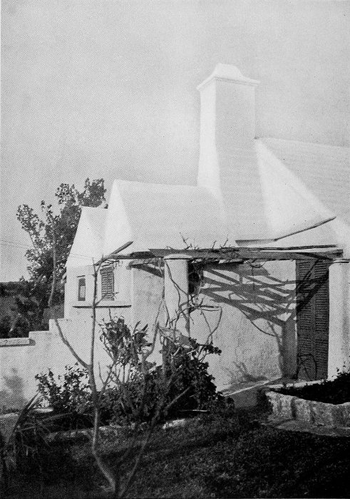 To those who are familiar with Bermuda and the houses there, these colorless photographs may be but sorry representations of the actuality, and can only serve to stimulate memory. White, or softly tinted houses with weathered green blinds and doors, frequently buried in luxuriant foliage and blossoms of vivid hues, with glistening white roofs silhouetted against intensely blue sky, or backed against the dull green of red trunked cedars, through which may be glimpses of a turquoise sea, make a strong impression on the senses, but fail to register with the camera—even when held by a more experienced hand than that of the author.