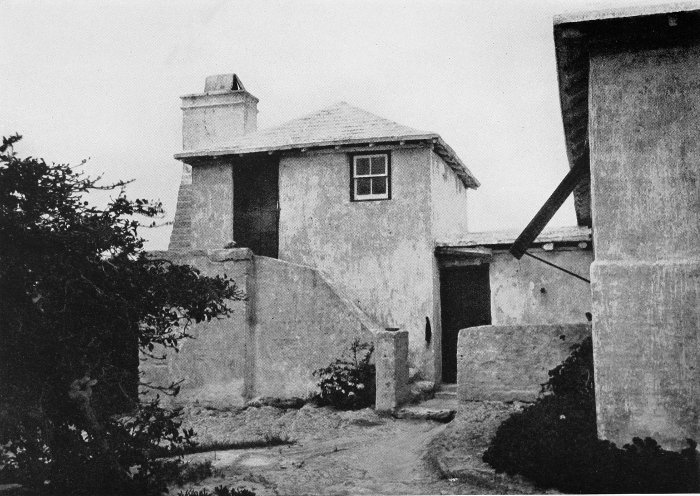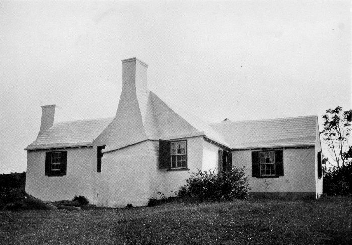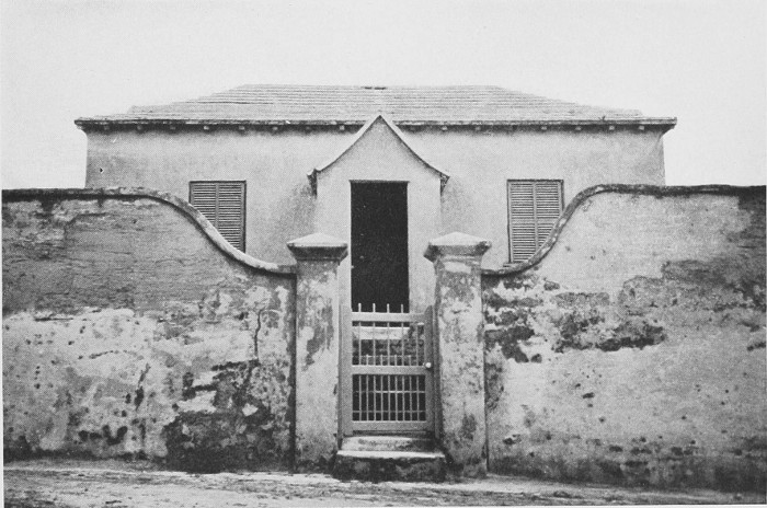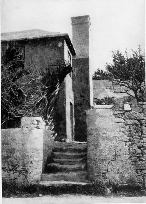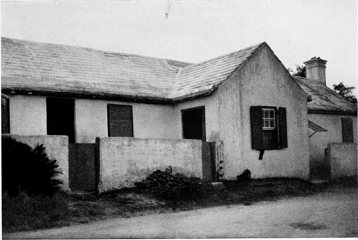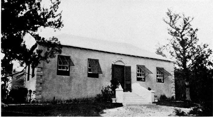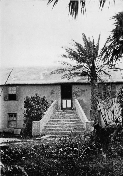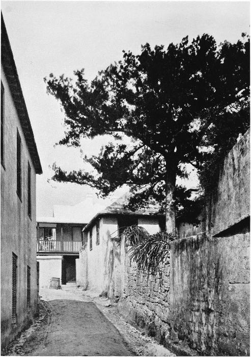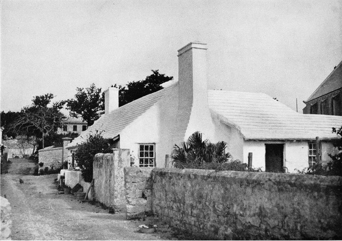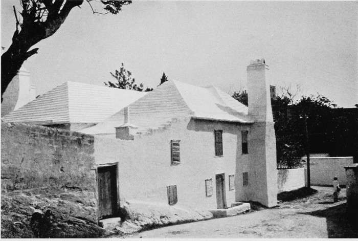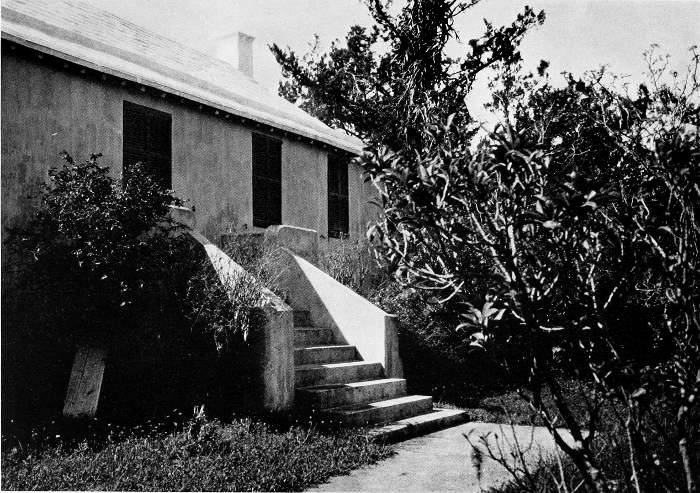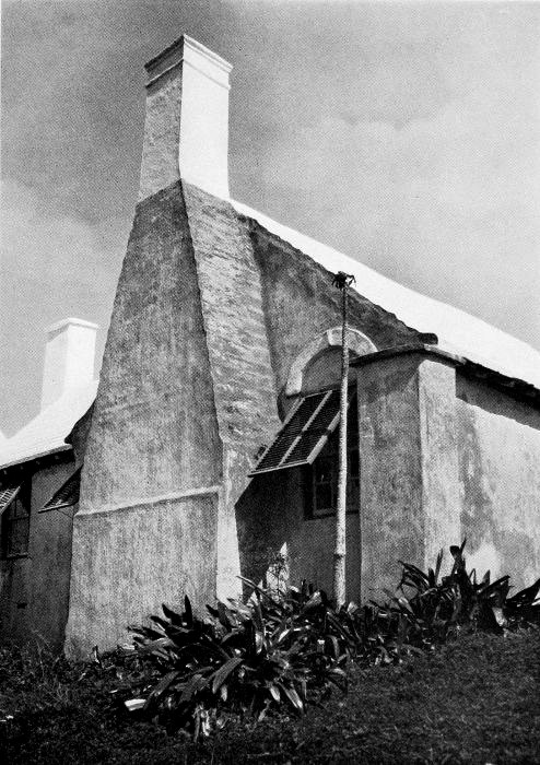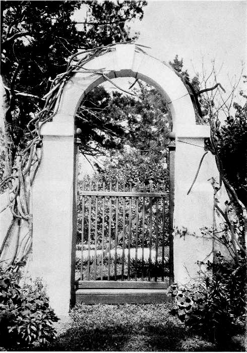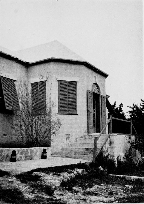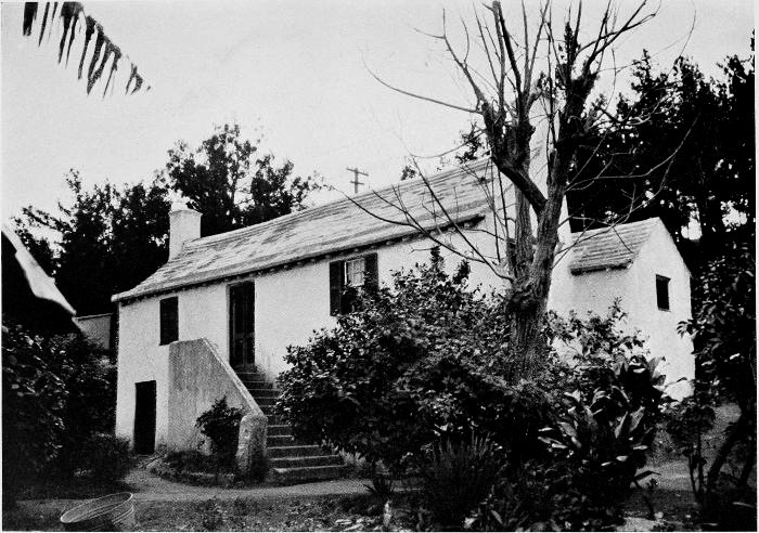 To those who are familiar with Bermuda and the houses there, these colorless photographs may be but sorry representations of the actuality, and can only serve to stimulate memory. White, or softly tinted houses with weathered green blinds and doors, frequently buried in luxuriant foliage and blossoms of vivid hues, with glistening white roofs silhouetted against intensely blue sky, or backed against the dull green of red trunked cedars, through which may be glimpses of a turquoise sea, make a strong impression on the senses, but fail to register with the camera—even when held by a more experienced hand than that of the author.