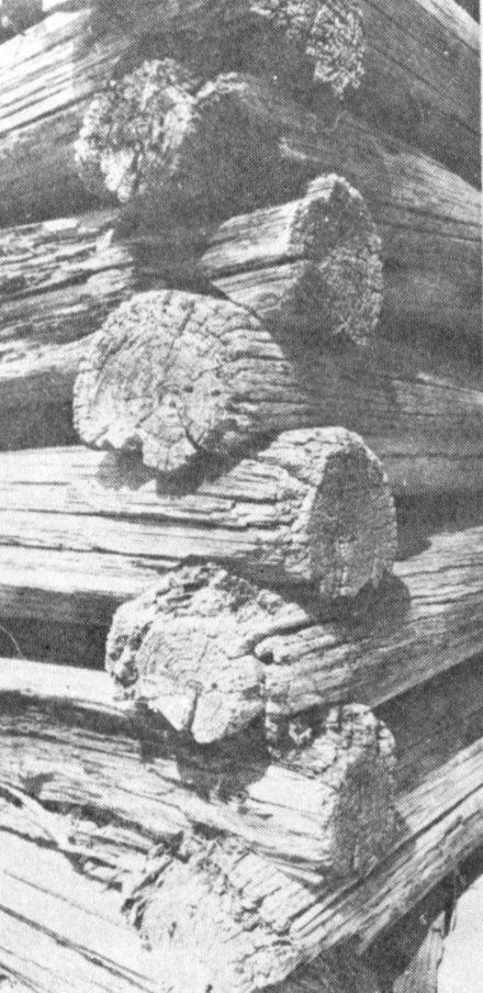 Some of the houses were built with whole peeled logs (Fig. 4); others with split logs (Fig. 5) and still others with square-hewn logs (Fig. 6). The logs were notched or “scribed” at the corners to fit securely and steadily. The style of the notch varied with the cultural background, skill or preference of the builder. Saddle notching, V-notching, Half-dovetailing, Square cornering, Halved cornering and a saddle-V combination are found in the Piney Woods (Figs. 7-12). Of these, the half-dovetail is the most difficult to produce. It is self locking, as is the Saddle and V-notch, while the Square and Half-Square require the use of pegs to hold the timber in place.
