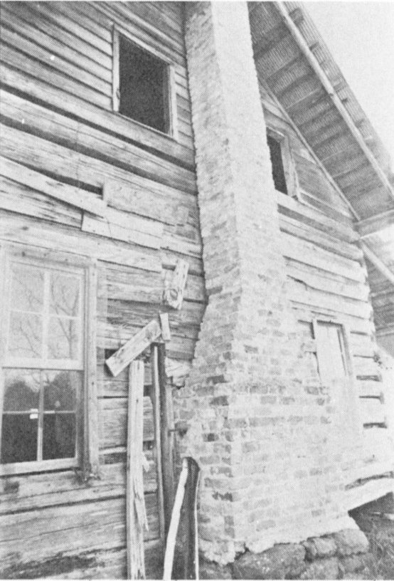 Each pen had a fireplace. The early chimneys were “catted,” made of “stick and mud,” and built on a foundation of native rocks, such as sand or iron rocks. The chimney was framed up with carefully laid pieces of oak strips. Prairie grass or sage was mixed with water and clay and thrown over each rung of the framing. The log grass overlapped each rung, filling the spaces. After the entire frame was covered, it was dressed down with mud. When the clay hardened, the chimney was ready for fire. Fireplaces were fitted with a bar and hooks to hold vessels for heating water and cooking. These inflammable stick-and-mud chimneys and fireplaces were replaced with bricks after kilns began operating (Fig. 16).