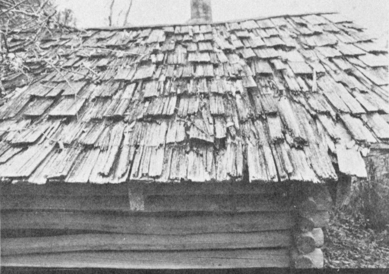 The rafters were made of small, peeled pine poles. Pine planks nailed to the rafters formed the base of the shingle roof. Straight grained pine trees were selected for roof shingles. The tree was cut into blocks eighteen to twenty inches long and split into “bolts.” A froe and maul were used to rive out the boards to a half-inch thickness and the roof was covered with the boards overlapping (Fig. 18). In the Piney Woods, such shingle roofs were called “board” roofs. Today most 18 have been replaced by tin or masonite. The overhang of the roof provided about eight feet front and rear for porches.