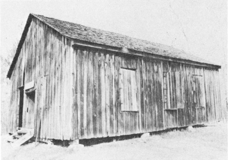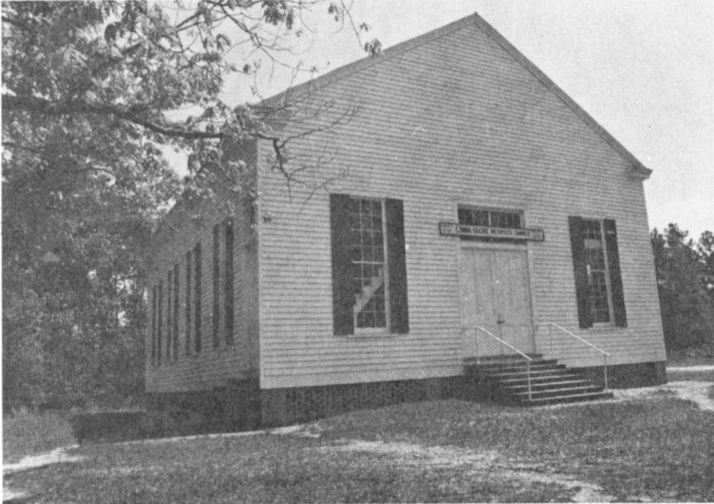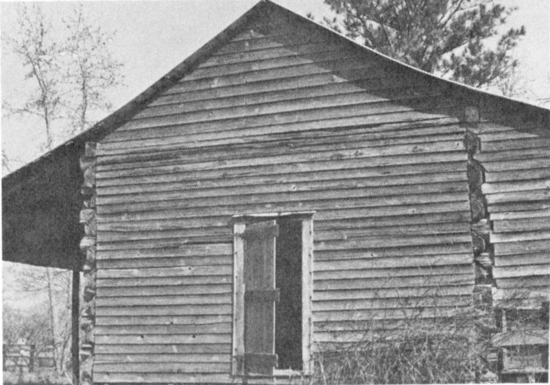 After transportation improved and as the country became more thickly populated, churches were built. Rural Piney Woods churches were simple structures. Boykin Methodist Church (Fig. 28) near Burns and Piney Grove Church at Polkville are typical examples. The pioneer church building was rectangular, made of rough sawn pine, with pine shutters at the windows and home-made benches fronting toward the home-made pulpit. There was no ceiling, with the room rising to exposed hand-hewn rafters. Often there were two front doors, one for the men and one for the women, and one rear door. On the grounds of Piney Grove, one can still see the long stretch of tables which were built for “protracted meetings” which took the place of camp meetings. Instead of camping out, the people attended services during the day and went home for the night. There was always “dinner on the ground” at the protracted meeting.