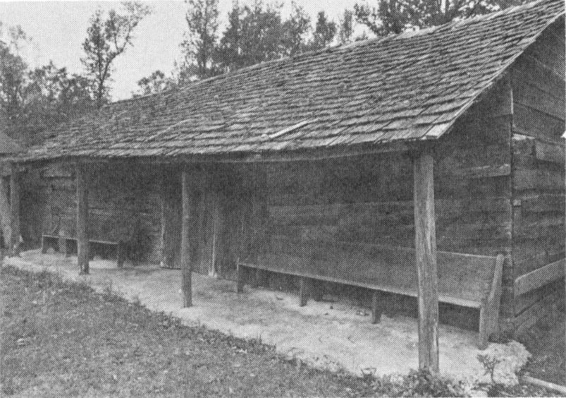 Serving a special function were the campgrounds where Protestant religious meetings were held once or twice a year, usually during “laying-by” time. The early camp meetings were held in an arbor-like shelter constructed of oak posts with V-tops forming a frame for horizontal poles that were then covered with leafy branches. This shelter was called the tabernacle. Rough plank seats were constructed by laying long planks on supports held up by stakes driven in the ground. The dirt floor was covered with pine straw or sawdust to keep the dust down and the pulpit was made of rough planks. Smaller shelters called tents where the people camped out were built around the tabernacle and furnished with pine plank or pole beds and tables, straw and shuck mattresses. Later more substantial campgrounds, such as present-day Salem Church campground, were built with a permanent tabernacle and sturdy cabins. The Salem Campground on the Jackson-George County line is the oldest extant campground in the state (Fig. 27). The first camp meeting at Salem was held in 1826 and the present site was selected in 1842. The campground today is still arranged in the original U-shape, but the materials of the buildings have been replaced. The tabernacle is built of rough lumber, with three sides open and log posts supporting the roof. The floor, covered with pine straw, holds wooden benches which can seat 300 people. The cabins which surround the tabernacle are still traditionally known as “tents.” Each cabin has two rooms, one for sleeping, one for eating, cooking, or sitting, and the floors are covered with pine straw. A wooden bench adorns each front porch. The oldest tent on the campground is the Parker tent built around 1880. Meetings have been held every year at Salem Campground since 1826 except for two years during the Civil War.