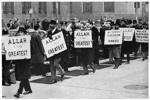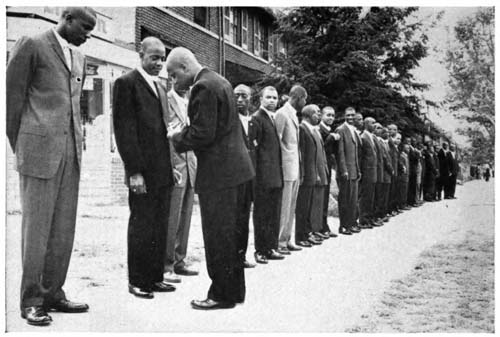 The men and women are ushered into the temple through separate doors and are ordered to sit on opposite sides. The[21] auditorium is generally a drab room, one used by many groups in the course of a week. In Birmingham, Alabama, for example, the Black Muslims use the Masonic Hall auditorium. The Sunday I visited the services there one could see posters, fans, and other materials left by groups who had used the same hall earlier in the week. The chairs of the auditorium are arranged in rows, a wide gulf between the “brothers” side and that of the “sisters.” Dark-suited young men, members of The Fruit of Islam, patrol the floor incessantly. They dart about, nudging children to silence, awakening a slumbering brother or sister, and performing whatever duties might come to hand, all the while keeping up a rapid-fire “That’s right,” “You tell it like it is,” in response to what the minister is saying.