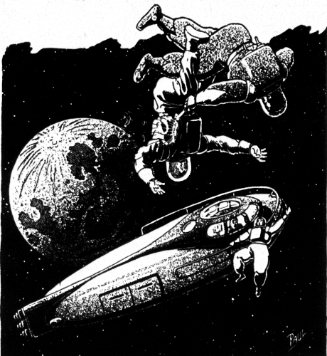 It was like a diver taking a step under water. I did not fall. I had let myself off the brink gingerly; and I felt my body sluggishly moving out a foot or two, with all the universe slowly, dizzily turning over. I am no skilled mathematician. Given the gross tonnage of the little X-87, doubtless astronomers could figure the relation of its gravity pull upon me, so close, compared to the giant bulk of the Earth, so far away. Perhaps even at forty thousand miles, and against the pull of the Moon, some two hundred thousand miles above me, and the X-87 only a foot or two—the Earth would slowly have drawn me down. But I knew that there was an aura of the vessel's artificial interior gravity out here. Len Smith had told me of many tests which had been made between the Earth and the Moon.