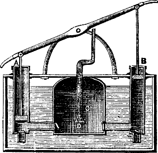 Weil der electrische Strom, welcher durch die beiden Metalle in Berührung mit der Flüssigkeit erregt wird, den Kupfervitriol chemisch zersetzt und metallisches Kupfer daraus abscheidet, welches sich an dem negativen Pole, also an dem Eisen absetzt. Auf dieser Zersetzung metallischer Salzlösungen durch den electrischen Strom beruht die Galvanoplastik, d. h. die Kunst, plastische Gegenstände, wie Münzen, Gypsabdrücke, Holzschnitte, Kupferstiche etc., in Kupfer treu nachzubilden. Gewöhnlich bedient man sich dazu eines weiten Glasgefäßes, in welches vermittelst eines Drahtringes ein kurzer, unten nur durch eine Thierblase geschlossener Glascylinder[196] eingehängt wird. In dem größeren Gefäße befindet sich die Kupfervitriollösung, in dem kleineren verdünnte Schwefelsäure. Dann wird ein starker Zinkstreifen mit einem Kupferstreifen zusammengelöthet und so gebogen, daß der Zinkstreifen in das engere Gefäß hinabhängt, während der Kupferstreifen in das weitere, mit der Vitriollösung gefüllte taucht und grade unter dem Boden des engeren Gefäßes eine wagerechte Fläche bildet, auf welche die in Kupfer nachzubildende Form gelegt werden kann. Diese Form verschafft man sich durch einen Abguß in Wachs oder Stearin, dessen Oberfläche man dann mit feinem Graphit- oder Broncepulver bepinselt und dadurch leitend macht. Der Strom, der hier zwischen Zink und Kupfer durch beide Flüssigkeiten erregt wird, ist nur schwach, genügt aber, die Vitriollösung zu zersetzen und im Laufe einiger Tage den Abdruck mit einer dicken Kupferschicht zu überziehen, welche genau der Form des Abdrucks entspricht. Auch die galvanische Vergoldung und Versilberung geschieht in ähnlicher Weise. Die Galvanoplastik wurde von Jacobi in Dorpat und von Spencer in England im Jahre 1838 fast gleichzeitig erfunden.