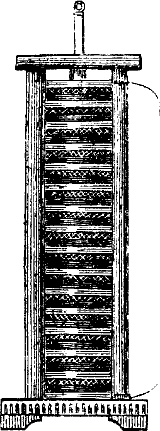 Weil die Metalle in Berührung mit Flüssigkeiten, namentlich gesäuerten, kräftiger electrisch erregt werden, als bei gegenseitiger Berührung. Taucht man eine Zinkplatte in eine gesäuerte Flüssigkeit, so wird das Zink negativ, die Flüssigkeit positiv electrisch. Taucht man auch eine Kupferplatte ein, so nimmt diese als guter Leiter die positive Electricität der Flüssigkeit auf, und verbindet man beide Platten durch einen Kupferdraht, so erfolgt durch diesen die Wiedervereinigung der getrennten Electricitäten. Da aber das Zink mit der Flüssigkeit in Berührung bleibt, so werden beide in demselben Augenblicke wieder electrisch, die positive Electricität strömt wieder vom Kupfer zum Zink. So besteht eine immerwährende Erregung und Ausgleichung der Electricitäten, und dadurch unterscheidet sich diese galvanische Electricität wesentlich von der Reibungselectricität, bei welcher immer nur augenblickliche Ausgleichungen möglich sind. Man nennt daher auch diese fortdauernde Bewegung einen electrischen Strom und sagt, daß der positive Strom vom Kupfer zum Zink gerichtet sei. Die Einrichtung selbst nennt man eine einfache galvanische Kette, oder ein[194] galvanisches Element (Fig. 107). Man kann aber auch mehrere solcher Elemente zusammensetzen, indem man die Zinkplatte des ersten Elements mit der Kupferplatte des zweiten, die Zinkplatte des zweiten Elements mit der Kupferplatte des dritten etc. durch einen Kupferdraht leitend verbindet. Eine solche zusammengesetzte Kette nennt man eine galvanische Batterie. Die äußersten unverbundenen Glieder derselben heißen ihre Pole und zwar die äußerste Kupferplatte der positive Pol, die äußerste Zinkplatte der negative Pol. Verbindet man diese Pole durch einen Leitungsdraht, so geht der (positive) electrische Strom vom Kupfer zum Zink. Man nennt in diesem Falle die Kette geschlossen, während sie geöffnet heißt, wenn kein Leitungsdraht die Pole verbindet. Die einfachste und älteste Form einer galvanischen Batterie ist die voltaische Säule (Fig. 108), die aus übereinandergeschichteten Zink- und Kupferplatten besteht, welche durch angefeuchtete Tuch- oder Pappscheiben von einander getrennt sind. Sie wurde zuerst von Volta in Pavia im Jahre 1800 construirt.