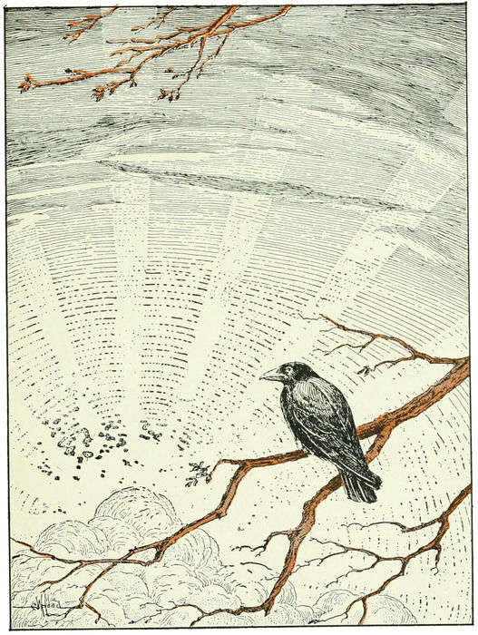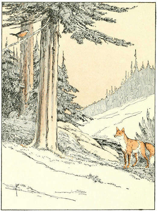 When the robin heard that he was terribly frightened. Then, rather than lose all his babies, he took one of them in his beak and dropped it down to the fox, who grabbed the little bird and ran away. After that Red Fox came back twice and did as before, the poor father robin being afraid to refuse to do what was asked. Trembling with fright and very sad, the poor bird looked about for some one to help him. The only living thing in sight was a crow flying by, and he called to him for help. The crow flew down into the tree and said, “What is it you want?”