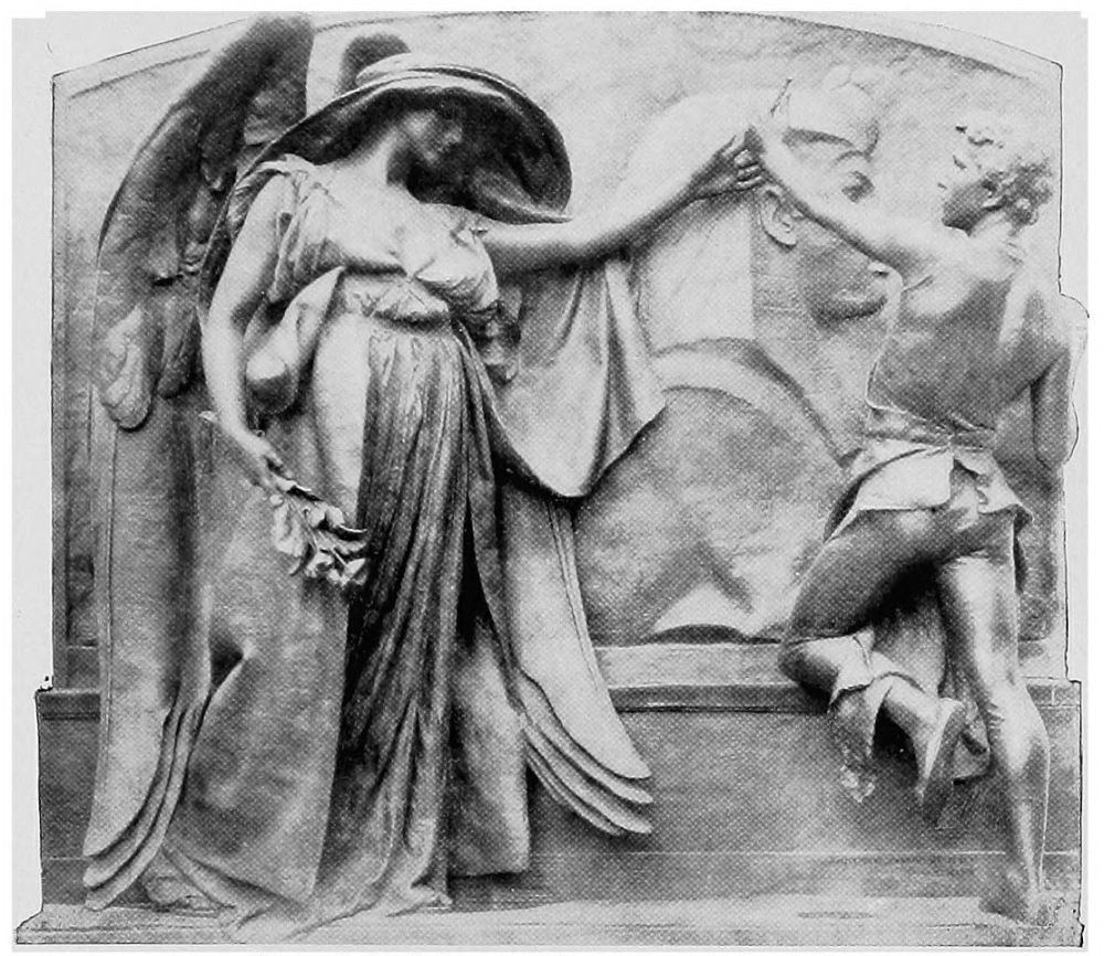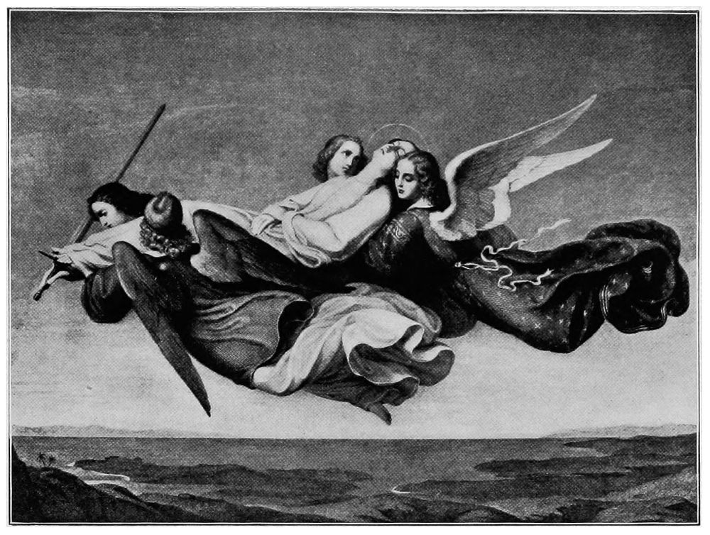 Modern artists have, speaking generally, wisely followed the examples of old masters in their treatment of angels. The poet Blake, however, is a notable exception to this rule. He painted angels that surely “sing to heaven,” while they float upon the air which their diaphanous drapery scarcely displaces, and seem about{42} to vanish and become a portion of the ether which surrounds them.