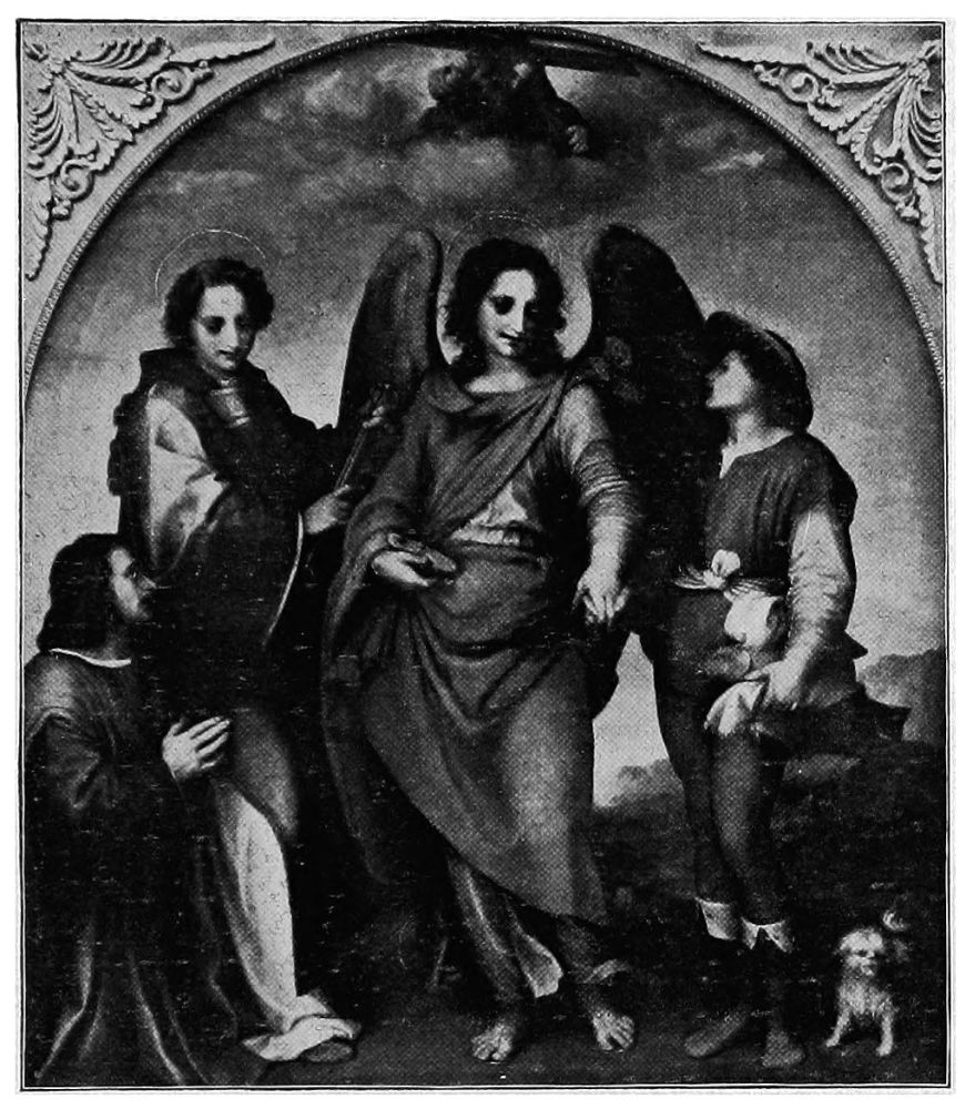 To whom, then, may one look for satisfactory angels? For myself, I answer, to Raphael, and especially to his later works. His angels are sexless, spiritual, graceful, and, at the same time, the personification of intelligence and power, as may be seen in our illustration of the Archangel Michael. Witness also the three angels in the Expulsion of Heliodorus from the Temple, in the Stanza della Signatura, in the Vatican. They are without wings, and none are needed to emphasize their godlike wrath against the thief who robbed the widow and orphan in the very temple of the Most High. The celestial warrior on his celestial steed,—believed to be St. Michael, in his office of Protector of the Hebrews,—the deadly{41} mace drawn back ready to strike the fallen robber, and his two rapidly gliding attendants, with streaming hair and swift, spirit-like movement, are such conceptions and personifications of superhuman power as can scarcely be paralleled in any other work of Art.
