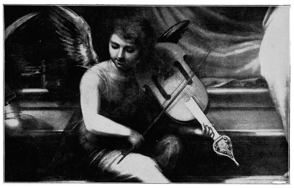 Two pictures of world-wide fame illustrate this change,—Raphael’s Madonna,{28} mentioned above, and Perugino’s Coronation of the Virgin. In the first, the entire background is composed of seraphs and cherubs apparently evolved from thin blue air, and in constant danger of disappearing in the golden-tinted background. In the second, the multi-colored wings of the floating cherubim are beautiful and the harmony of tones is exquisite, but they represent an innovation to which one must become more and more accustomed as artists are less reverent in their work.