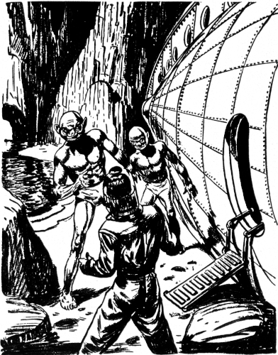 Immediately after the landing all hands, including Renzu, were busy with the routine duties that the expedition required. Gheal was given simple tasks, such as unpacking boxes of equipment to be used by the expedition, but the Venusian seemed to attend to these in a preoccupied manner. He worked in sort of a daze, frequently whimpering like a sick dog, and turning his globular eyes from time to time out of the porthole at the landscape of his native planet.