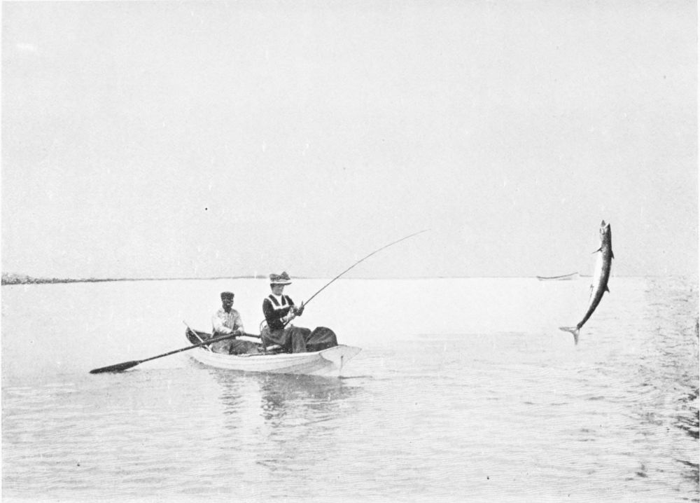 Tarpon fishing by night is exciting work, somewhat too exciting for many people. The fish, however, bite with{26} far more certainty than by day, particularly when the moon is shining. There is an element of danger about this night-fishing, and more than one nervous system has been shattered by a porpoise jumping into a boat; indeed, Mr. Otis Mygatt, one of the most celebrated of tarpon-fishermen, suffered severely from this startling intrusion.