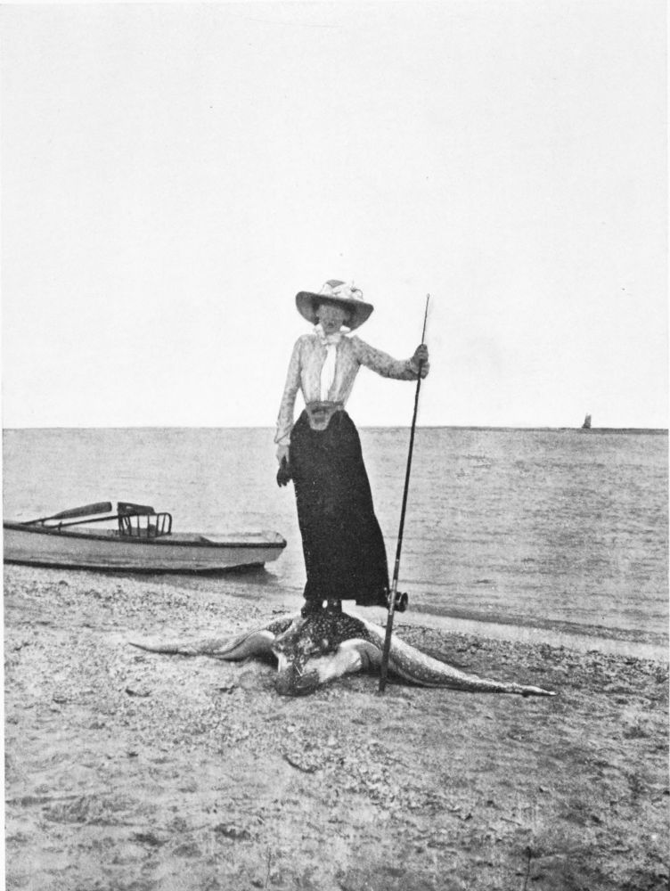 Before quitting the subject of the many successes achieved by women on those hunting grounds, I may mention one in which an enormous whip ray was foul-hooked, and the lady obligingly stood on her victim that the camera might do its share. On the whole, fishing in Florida seas may be said to offer thrilling sport to such ladies as are venturesome enough to give it a trial. There is just that spice of danger which sportswomen never resent, without the need of prolonged roughing it, that tries them far more than sudden calls on their endurance. As long experience and angling skill are not required, at any rate at present, a lady has on her first outing as good a chance as any one of hooking the record fish of the season, tarpon, jewfish, or shark, as the case may be; nor is the ordinary work of tarpon fishing, though beyond doubt arduous, such as to alarm any woman of average aptitude for outdoor sport. When you have fairly hooked your tarpon, you sit comfortably back in the armchair, your rod resting in a socket screwed on the thwart or suspended round the waist, and thus you pit your{81}
