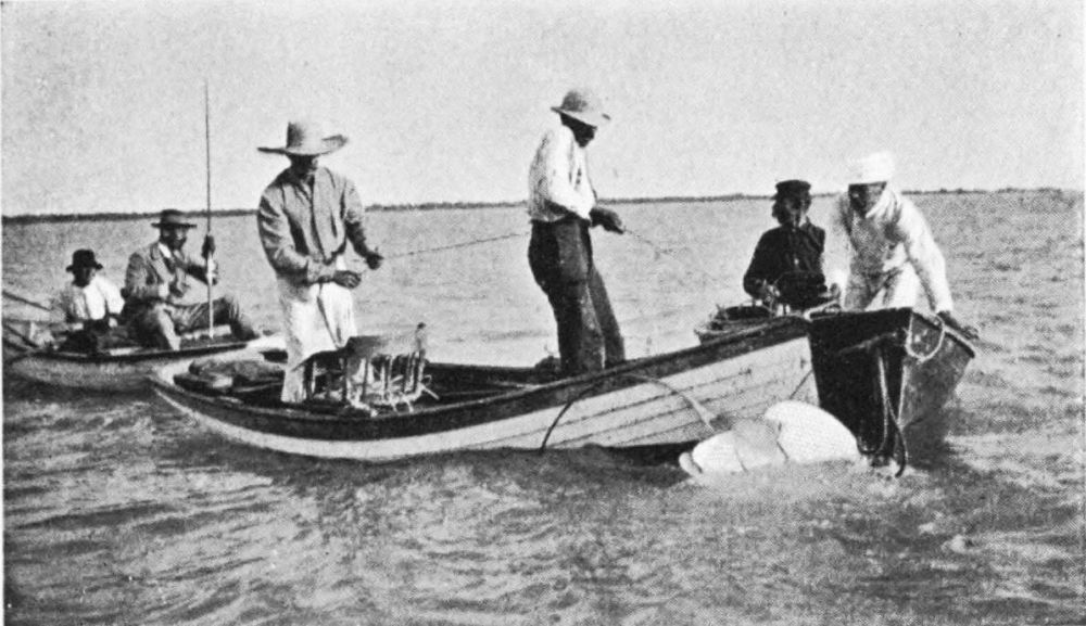 The Boca Grand Pass was not always the headquarters of tarpon trolling, for this modern method of fishing was first successfully practised some few years ago in the Captiva Pass. There is also good tarpon fishing in Aransas Pass, Mexico, where living and other expenses are much less than at Boca Grand, but the fish run smaller. In 1901 Hughes’ Floating Hotel was the only accommodation available, with the exception of hired yachts, and, though most comfortable in every way, had certain disadvantages arising out of the spot in which it was moored. There was also, however, to be shortly completed on Museppa Island, about three miles from Boca Grand Pass, a well-appointed hotel, with every modern comfort, including a steamer and launches to convey fishers to and from the Pass. Guides, bait, a photographing room, and shark-proof bathing establishment were among the attractions to be anticipated at this hotel for the next fishing season.{30}