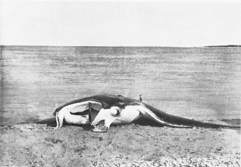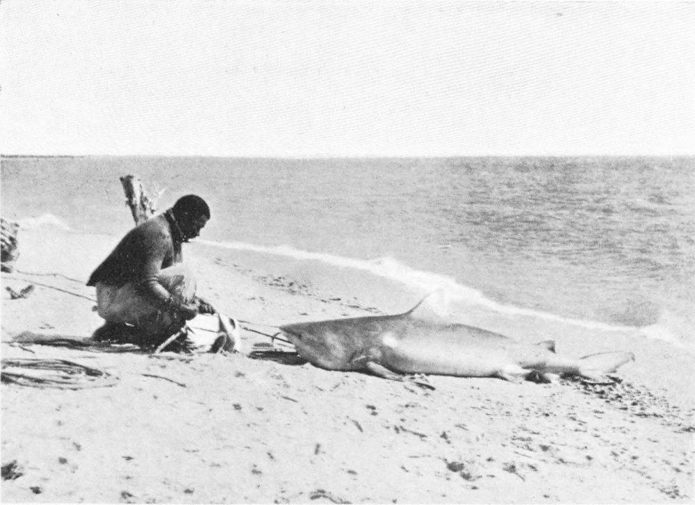 The infuriated fish tows the boat in all directions. It is too heavy to haul in, and must be got ashore. This is not very difficult, for you let it run free when heading in that direction, and check it when making a move for deeper water. At last it is beached. There is no occasion to cut out the harpoon, for all you need do is to thrust in your finger and press up the barb on either side, and it comes away at once.{94}