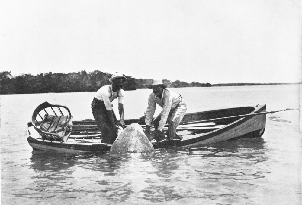 A small and sharp harpoon is necessary to penetrate the turtle’s shell, and it is important to make this change in your equipment if you go from rays to turtles. All being ready, your guide paddles you as quietly as possible into the pass, and you must get in the way of standing motionless in the bow in{112} a slight lop, for roughish weather is undoubtedly the best for turtle-spearing.
