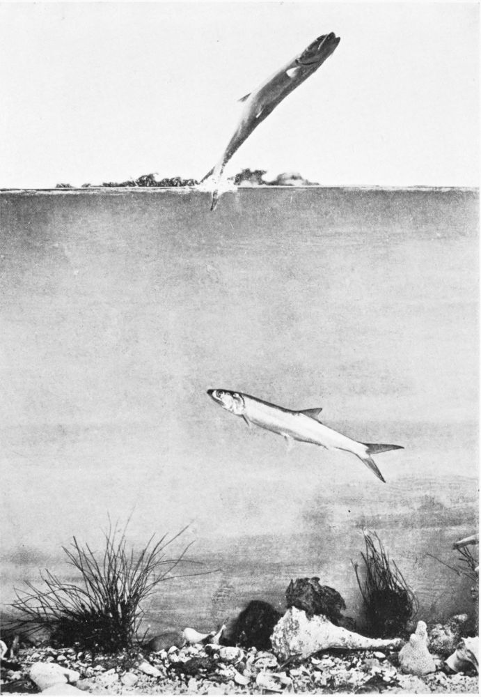 Presently, as the tide is all but done, some one gets a strike; up comes a hundred-pounder a second or two later, eight feet in the air, shaking his head in fury until his gills rattle loudly, then, with a plainly audible grunt, shaking free{54} first the leads, then the bait, and finally the hook, all in about a second of time. This performance, however disturbing to the novice, barely attracts the notice of the old hand, for he is well accustomed to such treatment, and does not regard his hook as fast until the fish has made its second jump in vain. Still, the sight of the fish acts like a magnet on the other boats, which are now being rowed towards the favoured spot with all the strength of their guides, who well know that, like most of the herring tribe, tarpon feed in shoals.
