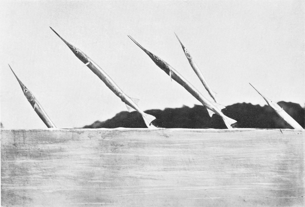 The kingfish is one of the swiftest swimmers in those seas, and the Spaniards recognise this by calling it “cavalla,” or the horse. I have shown two figures of kingfish, the one chasing a skipjack, its favourite food, below the surface, the other leaping in the air and throwing up a newly-hunted skipjack, an almost invariable habit. Indeed, a kingfish breaking water always appears to have a skipjack in readiness to throw up, and this, its next meal, accompanies it for about a third of its flight. Although the skipjack appears to be knocked out of the water by the kingfish, and sometimes shows bleeding rents in its sides, it may be that the leap is a voluntary one to avoid capture, for it is{61}