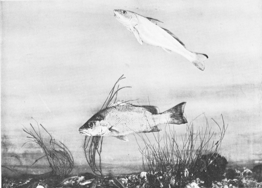 There are but one or two really successful photographers of living fish under water, and these artists must obviously confine their efforts to comparatively small fish in the confinement of aquarium tanks. Now, a considerable observation of fish at home and abroad under every variety of conditions has persuaded me (though I hardly expect the statement to pass unchallenged) that the narrow confines of the aquarium tank tend to cramped and unnatural attitudes in the subjects; and this contention seems to me abundantly substantiated by a careful comparison of the otherwise excellent photographs from time to time published, and the best studies of the best fish painters. My own system of illustration combines the two, and in great measure, I venture to think, obviates many of the faults of both. Constant observation of the fish in their natural habitat impresses on me their every attitude, and, while unfortunately not possessed of the necessary talent to transfer these groups to canvas, there is no insuperable difficulty in the way of pegging the various subjects in just the positions they assumed before my eyes an hour or two earlier. The camera does the rest.{14}