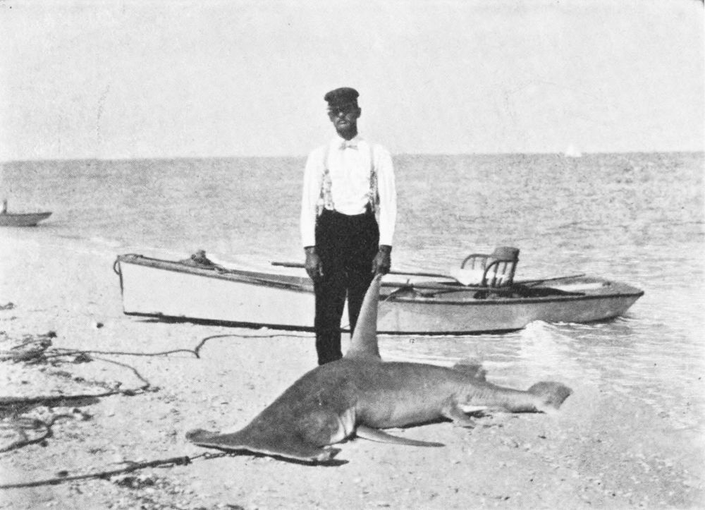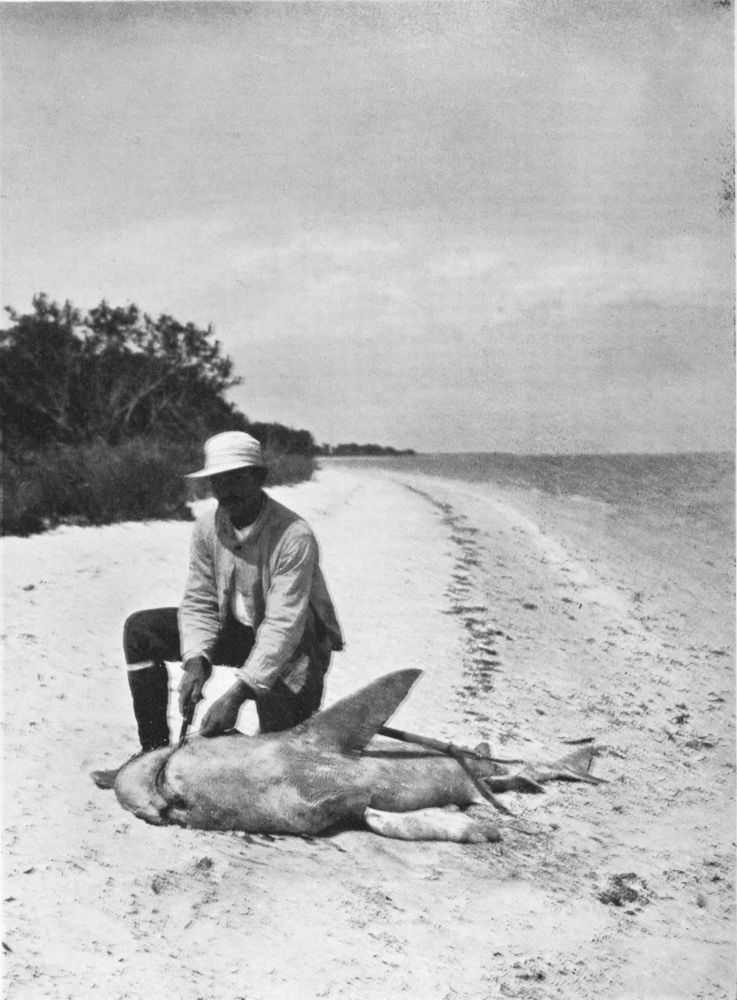 It is impossible to know how far one is drifting towards the open sea, and on all sides are heard the plunges of mighty fish, which are far more likely to land in the boat than during the day. A great tarpon may seize the bait and get round behind the angler, to his utter confusion. Even if the shore is reached in time, there is considerable difficulty and excitement in landing a tarpon on a dark night. Towards the end of May those who are not strong enough to land their tarpon without delay lose them to the sharks. As many as five of these monsters will attack a hooked tarpon at once, and on one occasion I remember four of them while thus engaged attacking a fifth, and in a few moments not a shred of that fifth shark remained. The angler recovered only the head of the tarpon. It is remarkable, seeing the position of the shark’s mouth, what rapid bites he can take at a struggling tarpon, just as we should take the first bite of a sandwich. It is no bad plan to carry a rifle in the boat so late in the season. It will often keep off sharks and save a good fish.