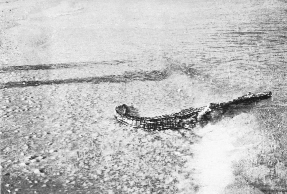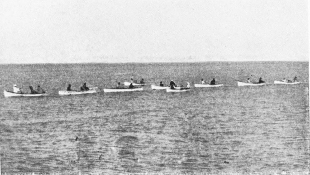On, and ever on, speeds this extraordinary procession, the like of which was surely never seen under other circumstances, propelled by an unseen power to an unknown destination with a force so great that it makes no account so far of the additional strain on its resources. Some have tried to back water as a check on the runaway, and have for their pains been almost thrown out of the boats and had the oars torn from, their hands. Onward they tear, the great fish keeping carefully in the deep channel-way, and avoiding treacherous shallows on its unrestrained course to the open sea. When the ray has thus run for five miles, it quite suddenly doubles on its course, with the surprising and discomforting result that the seven boats are tied in a knot. Quickly they will have to extricate themselves, else, as it is impossible to go full speed ahead in that formation, over they must go.