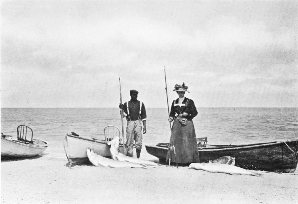 Before quitting the subject of the many successes achieved by women on those hunting grounds, I may mention one in which an enormous whip ray was foul-hooked, and the lady obligingly stood on her victim that the camera might do its share. On the whole, fishing in Florida seas may be said to offer thrilling sport to such ladies as are venturesome enough to give it a trial. There is just that spice of danger which sportswomen never resent, without the need of prolonged roughing it, that tries them far more than sudden calls on their endurance. As long experience and angling skill are not required, at any rate at present, a lady has on her first outing as good a chance as any one of hooking the record fish of the season, tarpon, jewfish, or shark, as the case may be; nor is the ordinary work of tarpon fishing, though beyond doubt arduous, such as to alarm any woman of average aptitude for outdoor sport. When you have fairly hooked your tarpon, you sit comfortably back in the armchair, your rod resting in a socket screwed on the thwart or suspended round the waist, and thus you pit your{81}