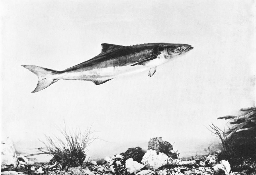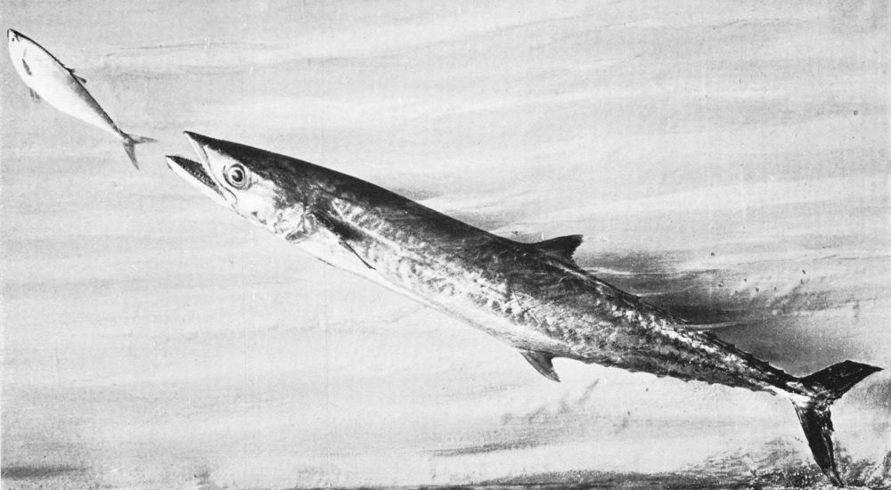 The kingfish is one of the swiftest swimmers in those seas, and the Spaniards recognise this by calling it “cavalla,” or the horse. I have shown two figures of kingfish, the one chasing a skipjack, its favourite food, below the surface, the other leaping in the air and throwing up a newly-hunted skipjack, an almost invariable habit. Indeed, a kingfish breaking water always appears to have a skipjack in readiness to throw up, and this, its next meal, accompanies it for about a third of its flight. Although the skipjack appears to be knocked out of the water by the kingfish, and sometimes shows bleeding rents in its sides, it may be that the leap is a voluntary one to avoid capture, for it is{61}