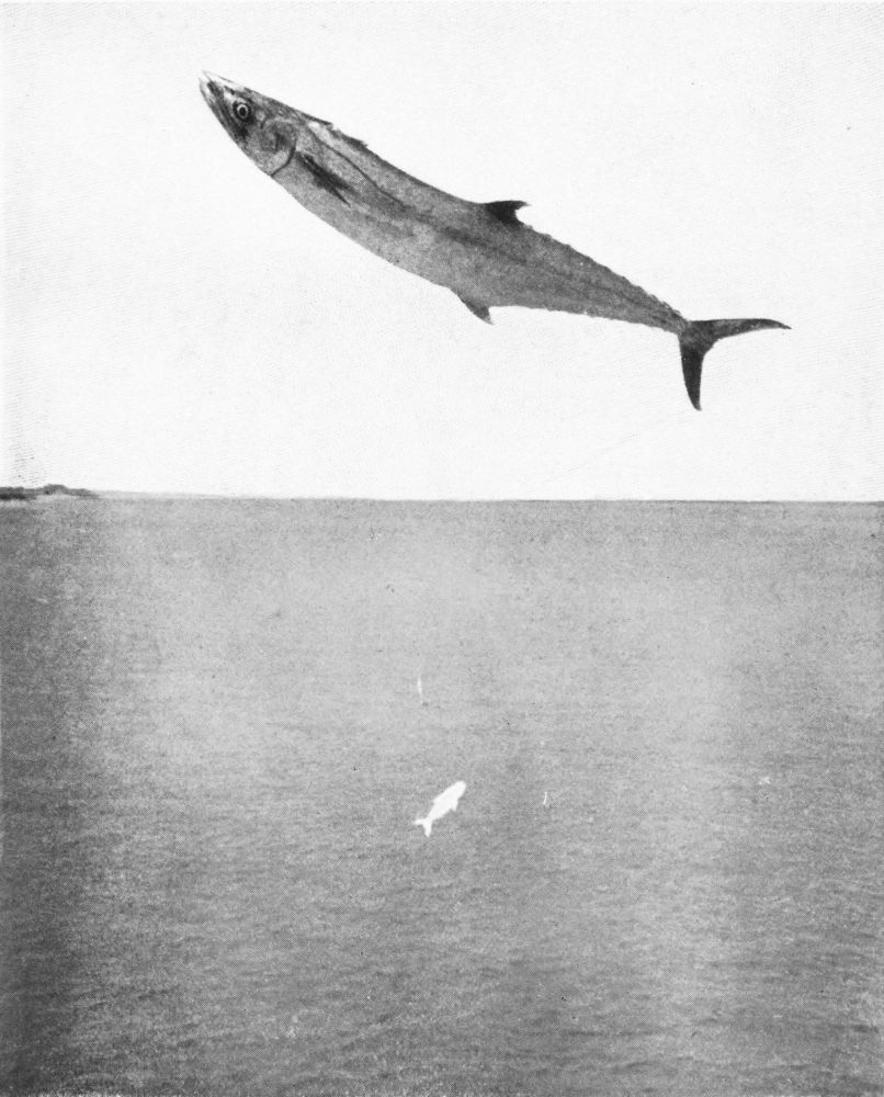 THE KING FISH LEAPT SOME 20 FEET INTO THE AIR, AND UP WITH HIM CAME A SKIPJACK DEEPLY GASHED ALONG THE SIDE.