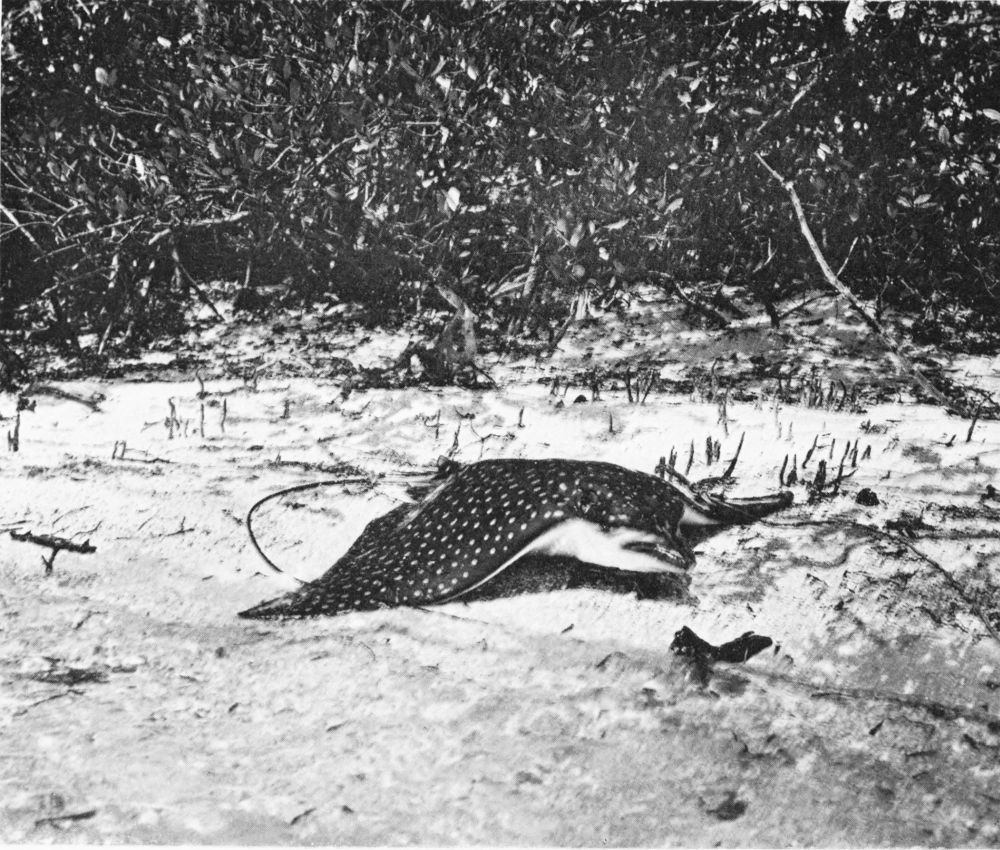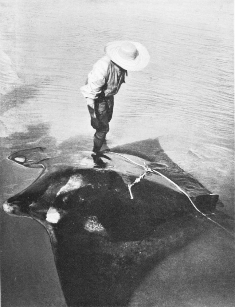 There are even larger rays on that coast than the whip ray. The giant ray, for instance, is one of the largest of existing fishes, and specimens have been captured measuring as much as twenty feet across the “wings.” Indeed, the Spanish and half-caste pearl divers call this ghoulish monster the “blanket,” from a fixed belief (though no one can have survived to tell the tale) that it envelops its victims as in a blanket, and then devours them at leisure. This sobriquet{92} survives in the adopted scientific name of Manta. It appears to me that such a diet is against all probability, if we may judge by the food of most of the order, but these men are firmly convinced that the giant ray, or, as it is also not inappropriately called, devil-fish, is an inveterate enemy to man, and they at least earn the right to an opinion on dangers to which they alone are constantly exposed.