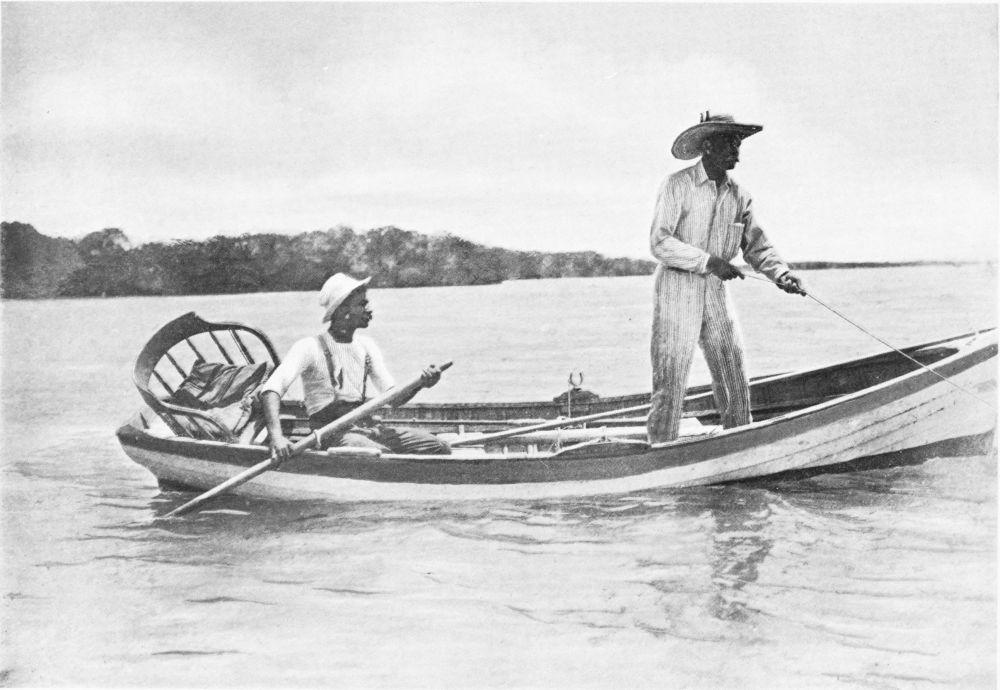They have to be at their employers’ beck and call at all hours of the day and night, and to help him get sport in a willing and efficient manner. During the fishing they have to exercise great care in manœuvring the boat, so as to keep a tight line when it is impossible to reel in fast enough. They must also be always on the lookout for moving tarpon, and they must, above all, have an unfailing supply of fresh and well-cut baits. All said and done, the daily wage of less than a sovereign for the guide and boat is well earned.