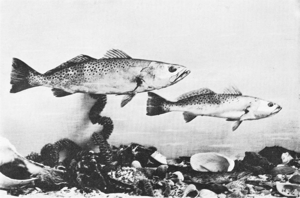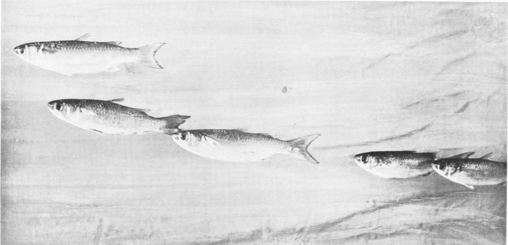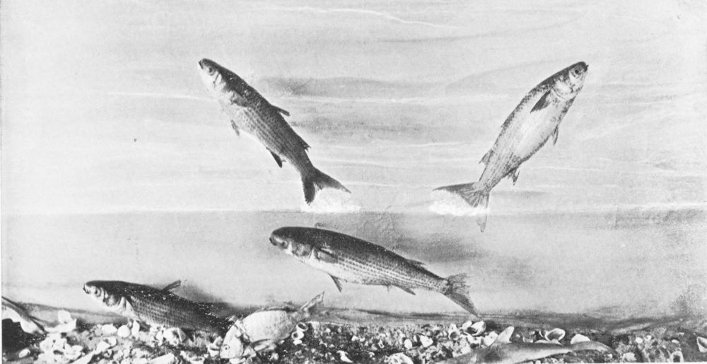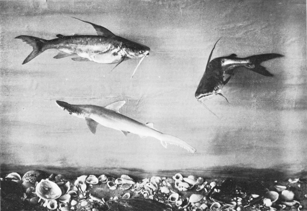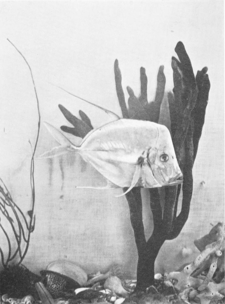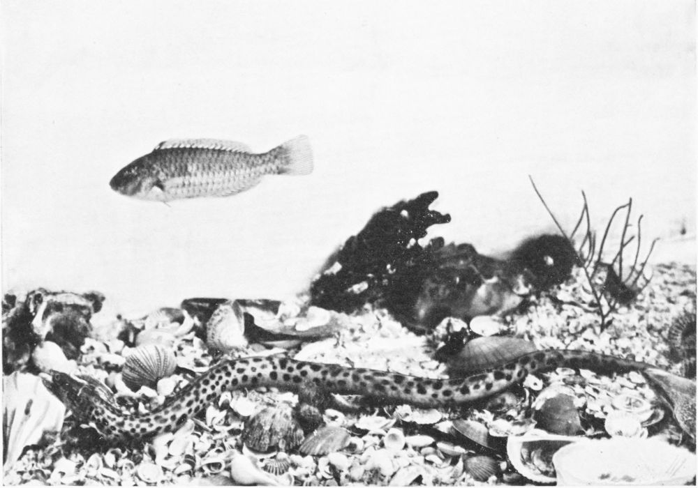 There are but one or two really successful photographers of living fish under water, and these artists must obviously confine their efforts to comparatively small fish in the confinement of aquarium tanks. Now, a considerable observation of fish at home and abroad under every variety of conditions has persuaded me (though I hardly expect the statement to pass unchallenged) that the narrow confines of the aquarium tank tend to cramped and unnatural attitudes in the subjects; and this contention seems to me abundantly substantiated by a careful comparison of the otherwise excellent photographs from time to time published, and the best studies of the best fish painters. My own system of illustration combines the two, and in great measure, I venture to think, obviates many of the faults of both. Constant observation of the fish in their natural habitat impresses on me their every attitude, and, while unfortunately not possessed of the necessary talent to transfer these groups to canvas, there is no insuperable difficulty in the way of pegging the various subjects in just the positions they assumed before my eyes an hour or two earlier. The camera does the rest.{14}