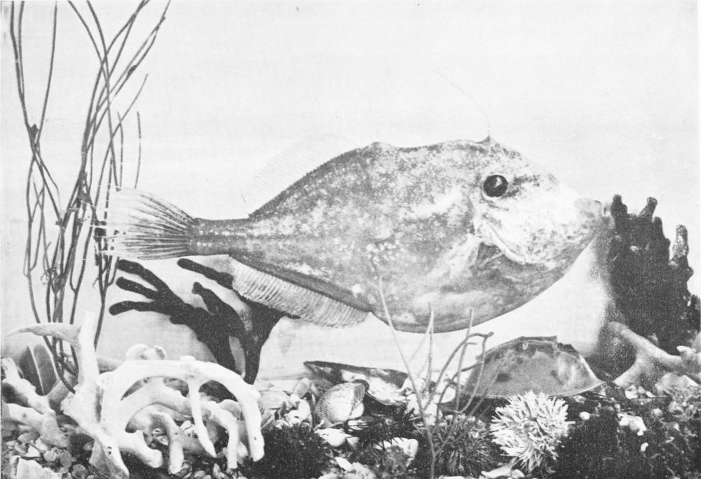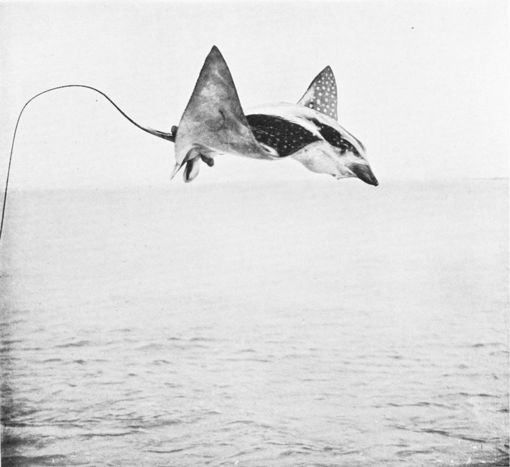 Rays, which are somewhat closely related to the sharks, though so different to the casual observer, are characteristic of all seas, but especially perhaps of the tropical waters of America, where some of them attain to enormous weight. The stingrays, of which the one depicted in this volume is a variety, armed with formidable serrated spikes at the base of the tail, are in some cases fearsome creatures, while many of the family are provided with the means of numbing their victims with an electric discharge. The whip ray, however, though carrying spikes above the tail, is a harmless and indeed beautiful creature. At the same time, its frantic leaps when driven wild by the suckers that adhere to its disc are sufficiently alarming to those unaccustomed to its ways.