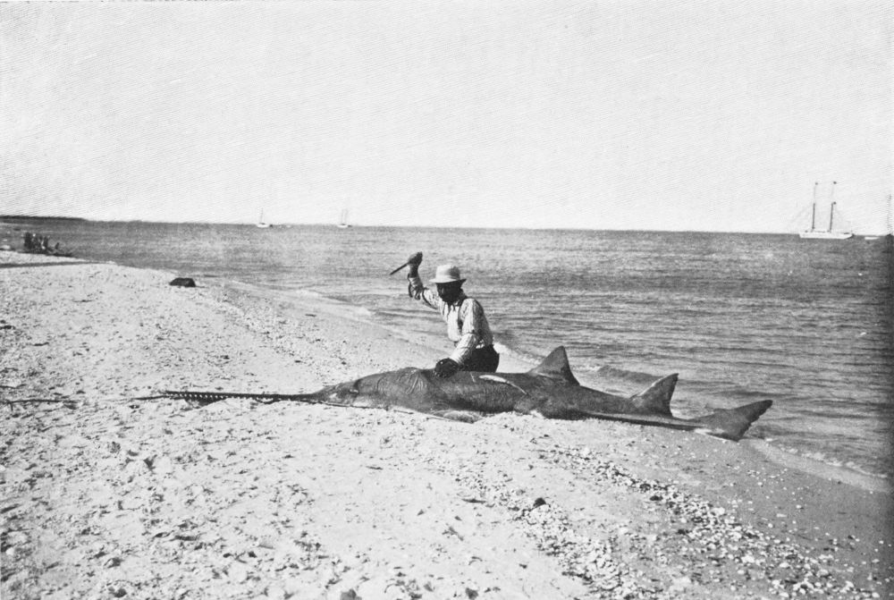 The proper way to capture these creatures, if any one cares about an occasional hour’s excitement, is with the harpoon. As for catching them on the rod, it is only done by foul hooking, and it merely strains the arms and tackle in what cannot be described as a very good cause. Harpooning, however, may be really exciting, and I will try to describe such an adventure to the best of my recollection.